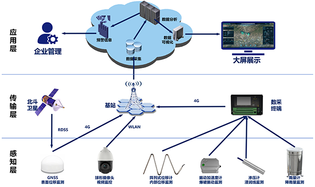 系统包括表面位移监测、内部位移监测、爆破振动监测、地下水位监测、降雨量监测、视频监控等,以及对数据进行分析、应用的矿山企业实时感知预警软件系统。