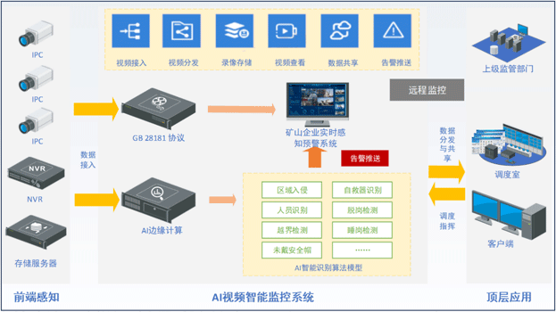 系统面向井工煤矿、露天煤矿、金属非金属露天矿山、金属非金属地下矿山,实现视频数据的统一接入、统一管理、统一运维。利用AI智能识别算法等新技术,对图像视频数据进行全面感知与智能分析,实现全天候的视频监控以及精准的分析识别,助力矿山企业提升智能化水平;通过异常状态与违规行为的实时监测、生产的全面感知,及时预警上报异常情况等功能,铸造安全的生产环境,保障工人安全,助力矿山企业安全高效生产。