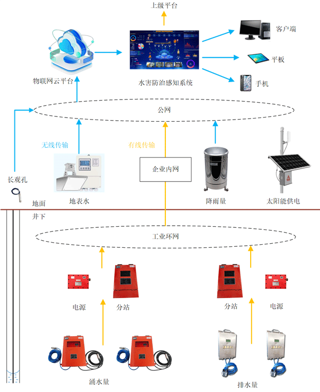 煤矿水害在线监测系统综合考虑矿山的地形、地质条件、开采进度、历史水害情况及未来开采规划等因素进行监测点位的布设,通过降雨量监测、地表水监测、涌水量监测、排水量监测、长观孔监测等确保监测网络全面覆盖潜在风险区域,实现精准监测与预警。